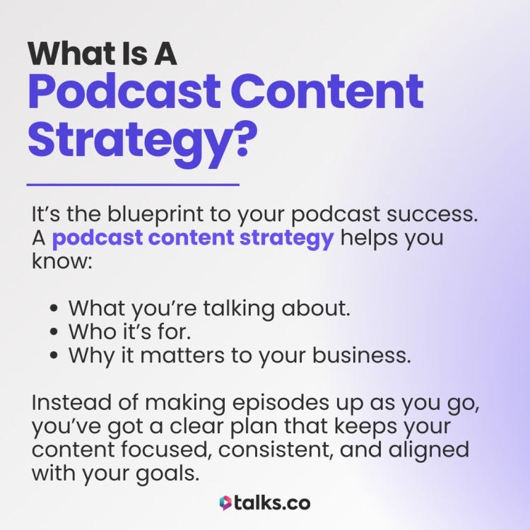 Check out the 12-step guide I use with every client: Talks Podcast Content Strategy