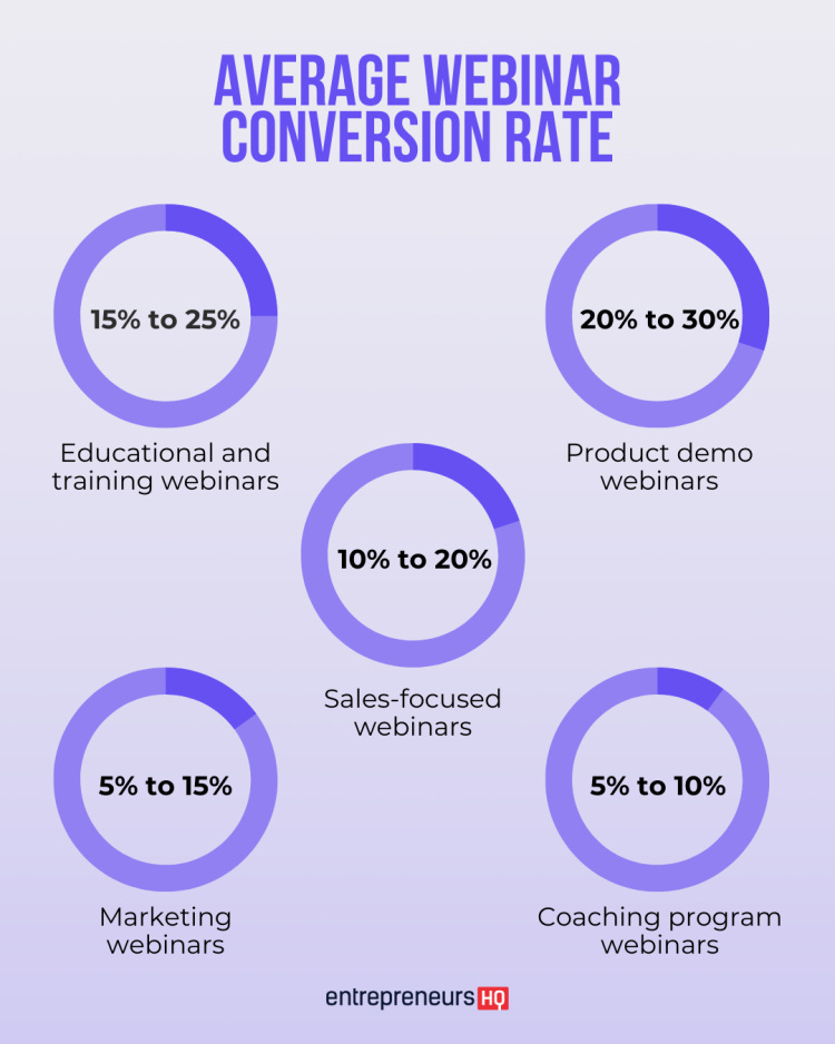 Typical coaching webinars convert 5-20% of attendees. High-ticket offers lean lower (5-10%), low-to-mid-tier offers convert higher (15%+).
